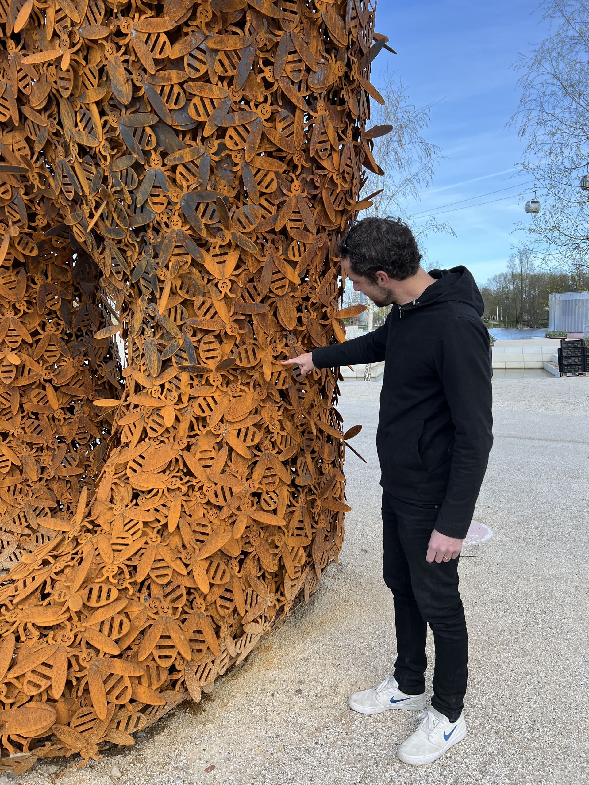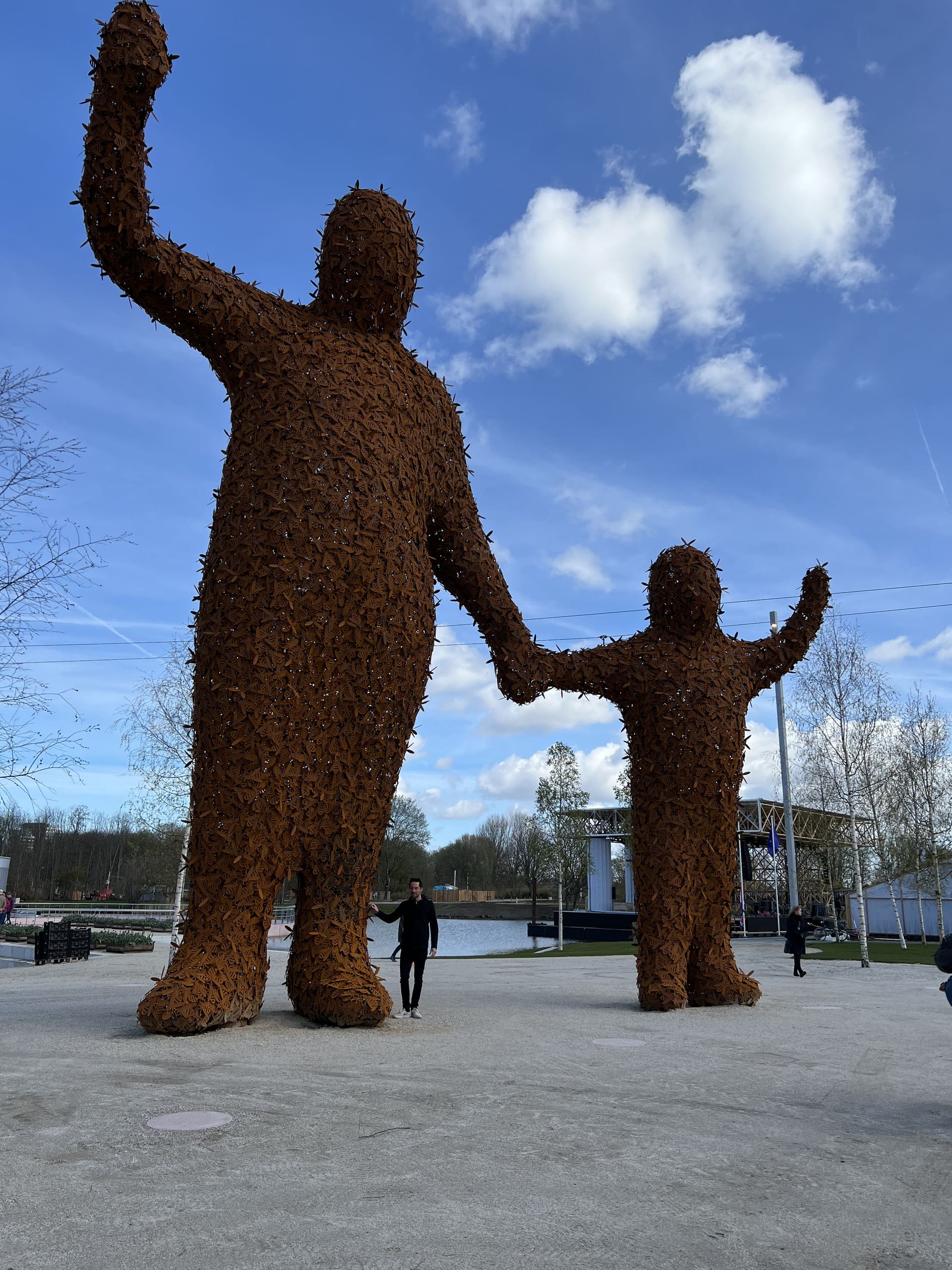 Beehold is a monumental artwork by Florentijn Hofman, brought to life by Job Art. This impressive installation features two human figures, each standing twelve meters tall, constructed from corten steel. The figures, a silhouette of an adult and a child, represent the current generation responsible for environmental impact and the next generation who will inherit our planet. However, these are not traditional human forms: a closer look reveals that the figures—or perhaps just their “skin”—are entirely made up of bees.