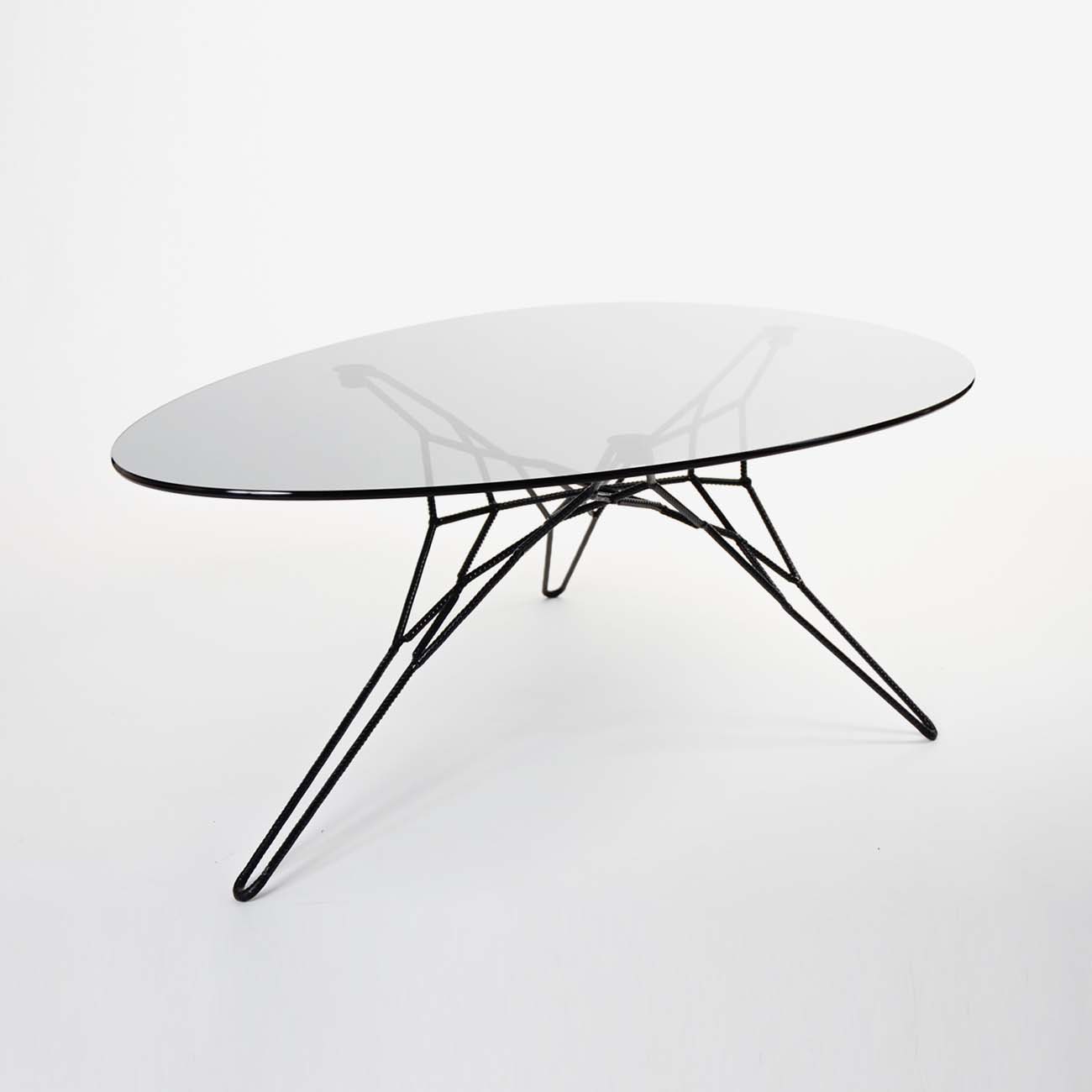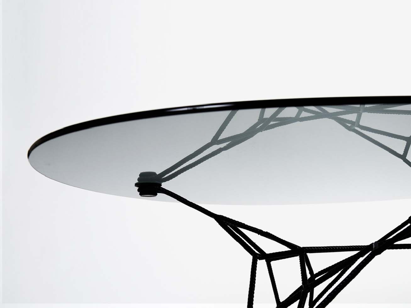 The process started with a 3D model, which I refined into an efficient structure. By simplifying the initial model down to 60 straight lines, I created a form that’s both practical and visually compelling. Each bar was welded together in the workshop using precise molds, ensuring a balanced and sturdy frame. Although steel is typically heavy, this design gives the table an airy and transparent presence, enhanced by the use of smoked glass as the tabletop. This smoked glass subtly reveals the structure beneath, making the geometric network of steel bars an integral part of the table’s aesthetic.