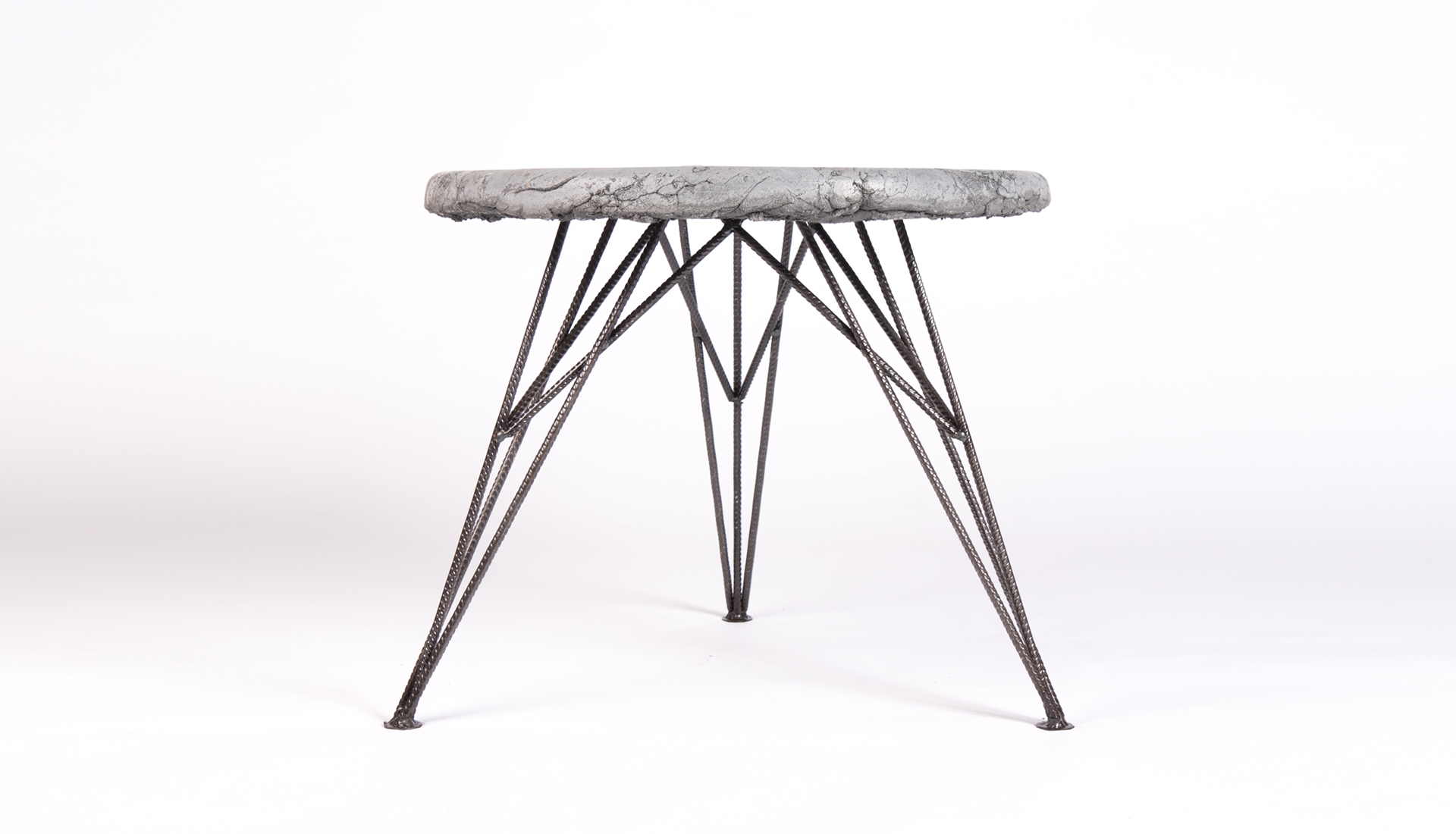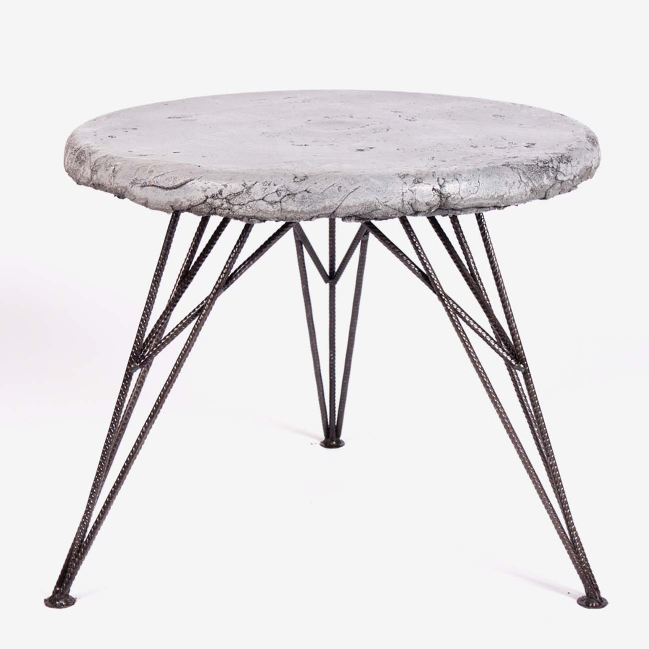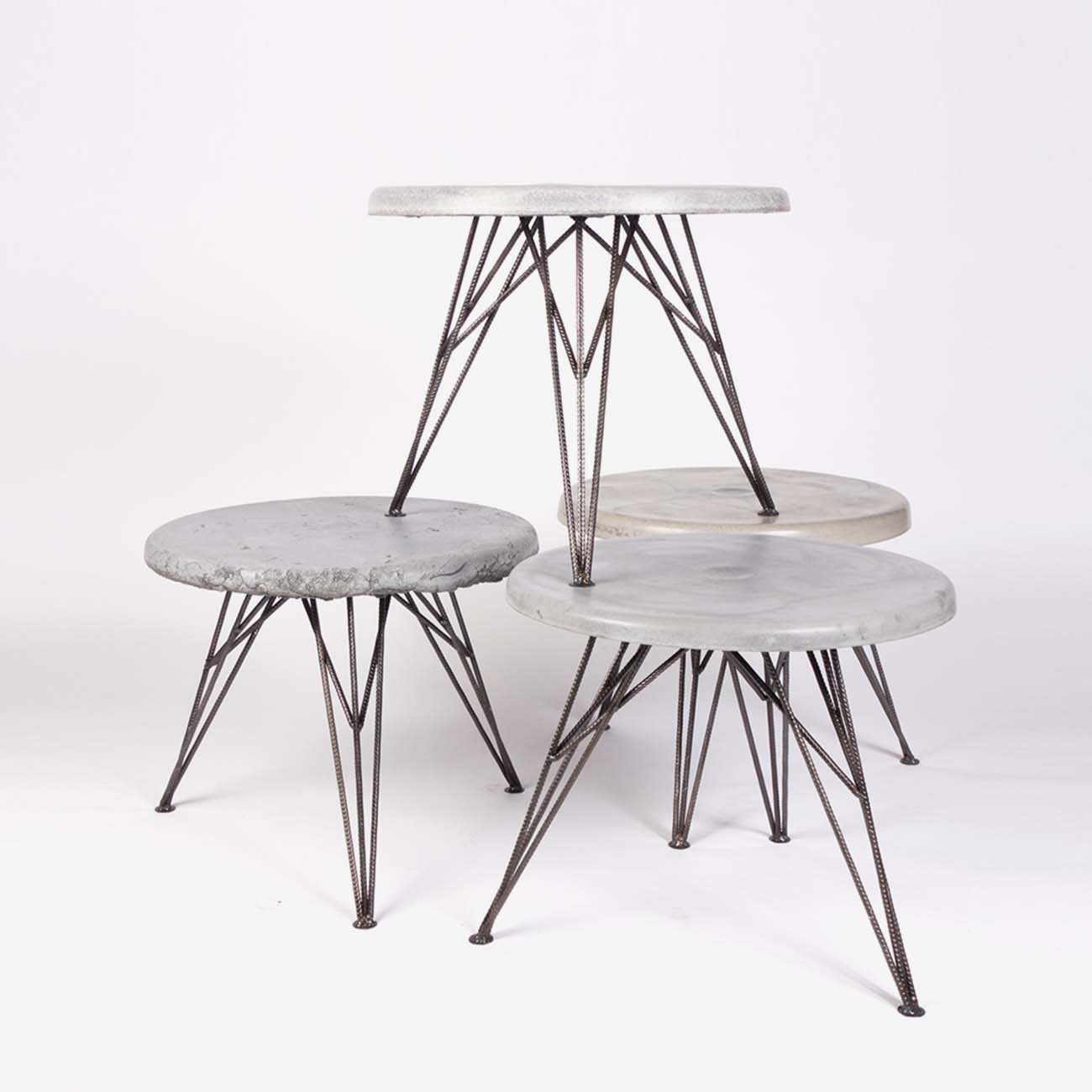 In honoring the traditional tools and methods of working with concrete, I use a tub—typically employed for mixing—as the mold for each piece, embedding a sense of craftsmanship in the process. The legs, made from rebar, are angled to provide stability while maintaining a light, airy look. Rebar, commonly used to reinforce concrete, connects the piece back to its industrial roots, highlighting both the strength and the aesthetic potential of these materials.